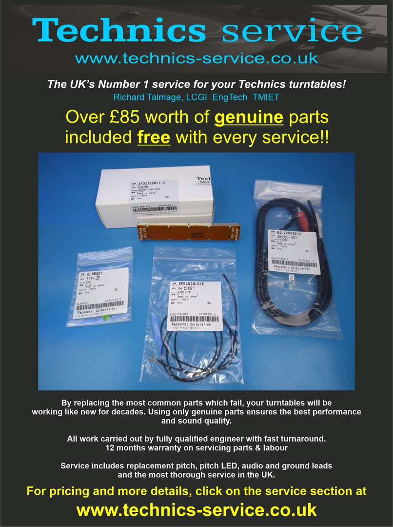 I carry out a very thorough and efficient service which takes on average 2.5 hours per turntable, going far beyond the few minor tweaks as stated in the service manual. Also exclusive to me is that I actually replace the pitch sliders for brand new genuine parts on all models (included free of charge in the service price). This is becauses just cleaning them up is not sufficient for their continued performance, due to the slide shoe spring contacts becoming weak over time.